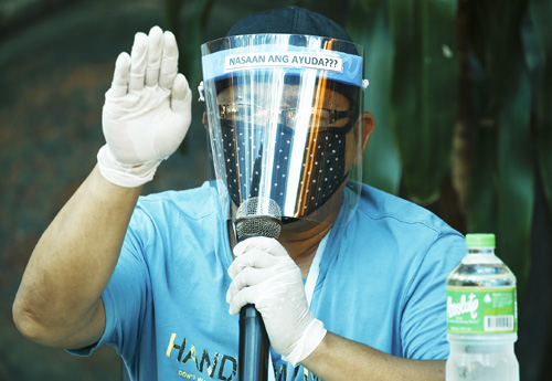 「労働者の日」の記者会見で防護具を付けて支援強化を訴える労組員(EPA=時事)