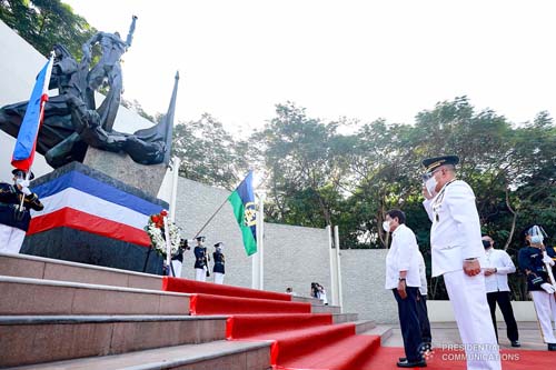 アンドレス・ボニファシオやカティプナンを象徴する像に向き合うドゥテルテ大統領=首都圏サンフアン市のピナグラバナン記念碑(大統領府報道班提供)
