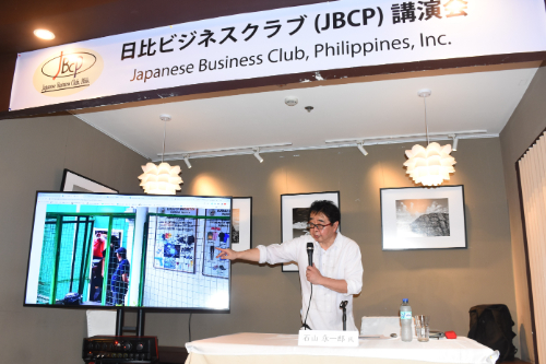 講演をする石山永一郎氏=15日、首都圏マカティ市=竹下友章撮影。
