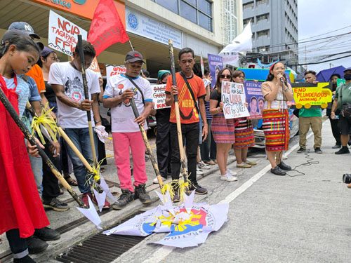 「世界の先住民の国際デー」に合わせてケソン市で抗議集会を行う先住民やその支援者たち=市民団体「カトリブ」提供写真