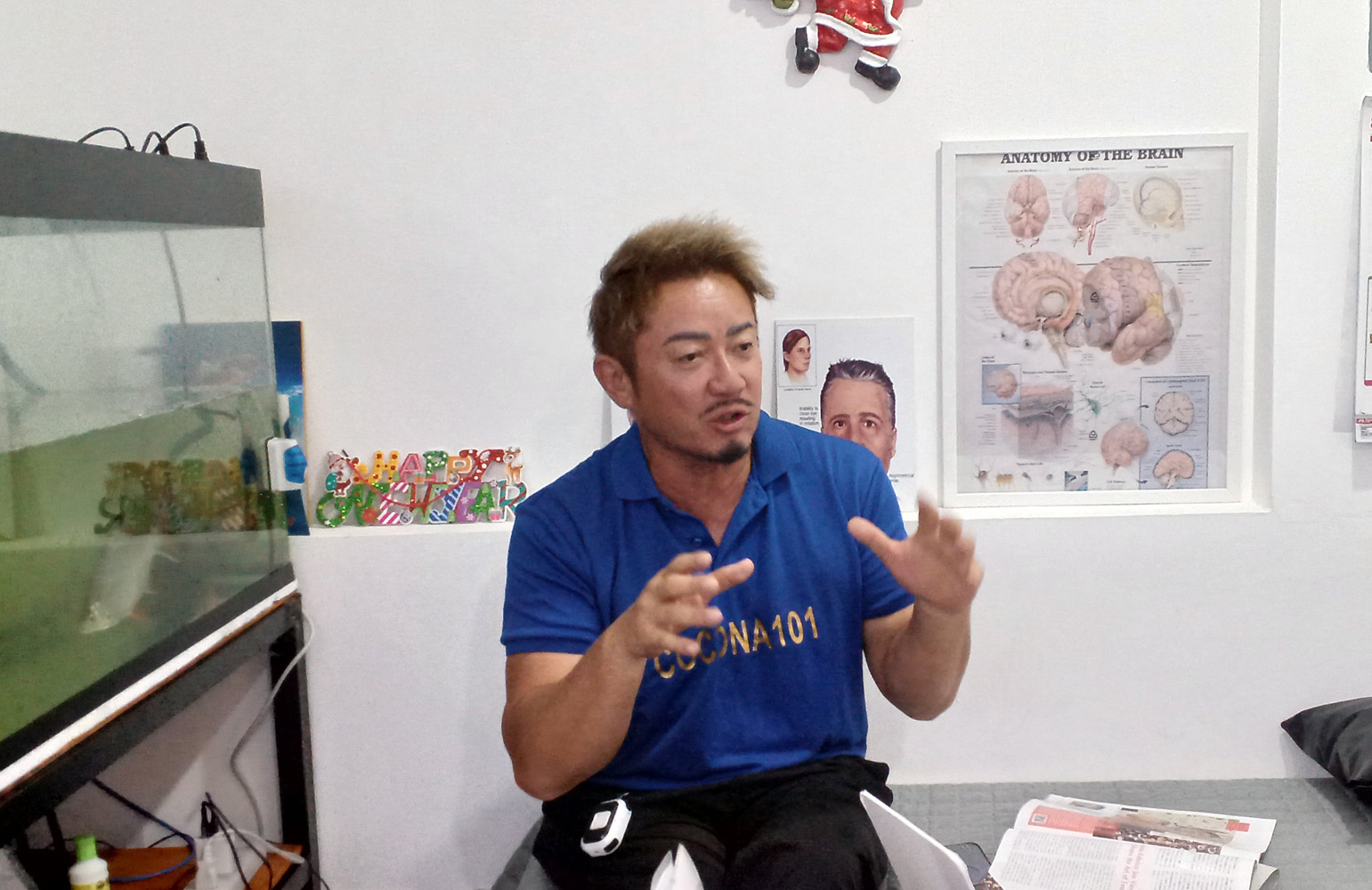 施術について熱をこめて語る中原さん=首都圏マカティ市の治療院で青柳一臣撮影