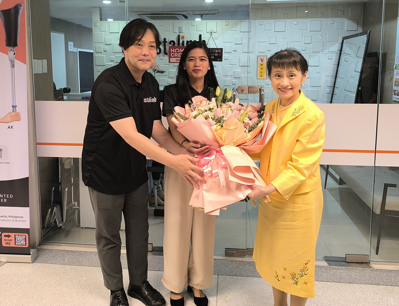 石破佳子首相夫人(右)に歓迎の花束を贈るインスタリムの徳島代表取締役(左)と同社職員=マリー・マナリリ撮影