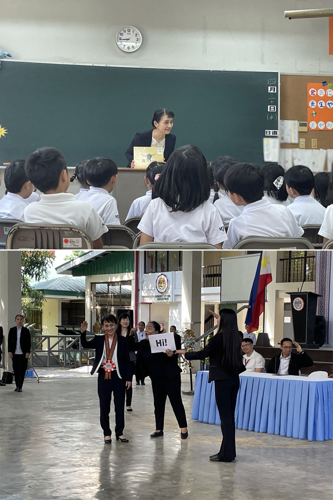 (上)小学生に読み聞かせをする佳子夫人。(下)ろう学校の生徒とともに手話を学ぶ佳子夫人=4月30日、タギッグ市マニラ日本人学校で宇井日菜撮影
