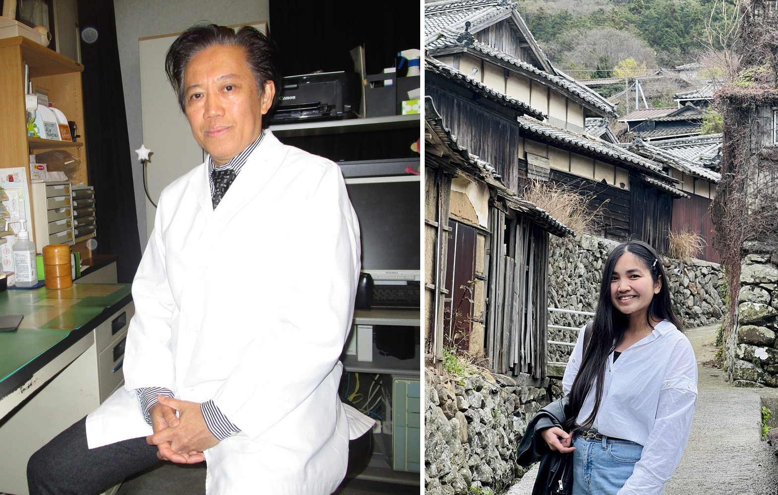 (左)眼科クリニックの院長を務める寺岡マイケルさん=今年2月3日、大阪市淀川区の松岡眼科の診療室で。(右)曾祖父の郷里を訪問した時の田口メラさん=2023年3月、山口県・八島で(写真は田口さん提供)