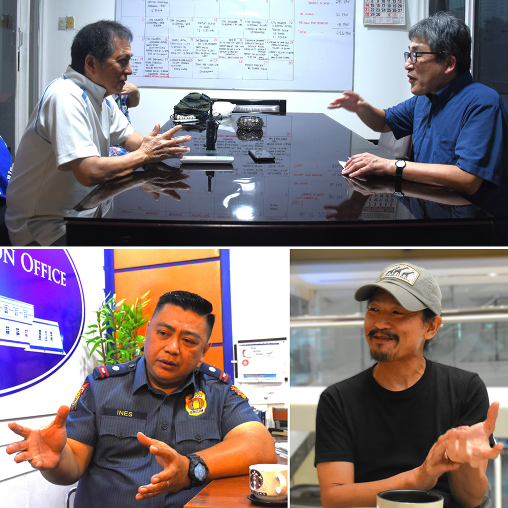 (上)MACROのランゴメス代表とインタビューする荒教授。(右下)フォトジャーナリストのレルマ氏。(左下)=首都圏マンダルーヨン市で竹下友章撮影