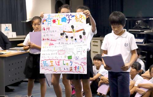 理想の青空学級について説明するマニラ日本人学校5年3組の生徒たち=16日午前10時ごろ、首都圏マカティ市のJICA事務所で岡田薫撮影